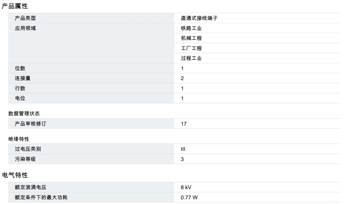 直通式接線端子, 標(biāo)稱(chēng)工作電壓: 800 V, 額定電流: 24 A, 連接量: 2, 位數(shù): 1, 接線方式: 直插式連接, 額定接線容量: 2.5 mm2, 橫截面: 0.14 mm2 - 4 mm2, 安裝方式: NS 35/7,5, NS 35/15, 顏色: 白色