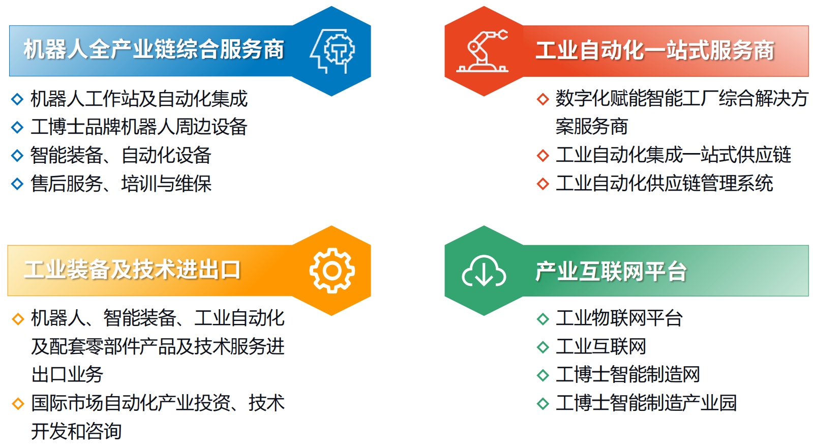 公司業務覆蓋智能裝備、產業互聯網、工業自動化、工業裝備出口四大核心領域。致力于打造行業機器人、