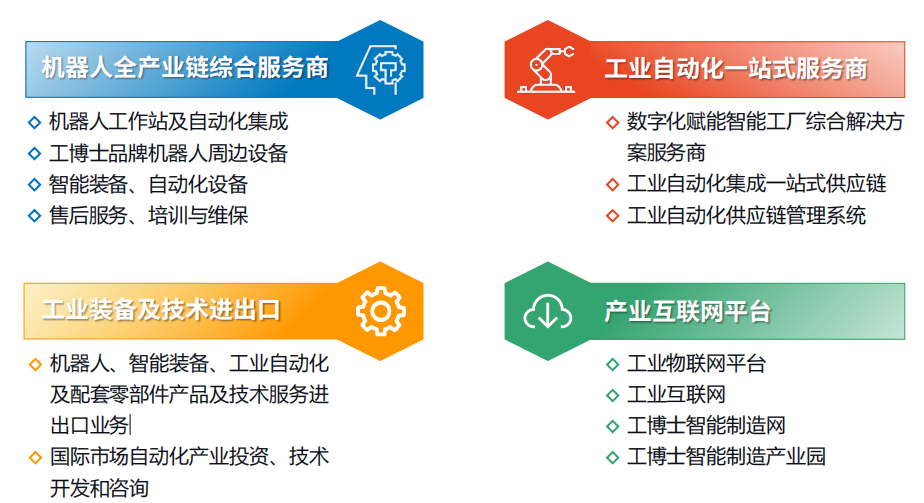 公司業務覆蓋智能裝備、產業互聯網、工業自動化、工業裝備出口四大核心領域。致力于打造行業機器人、