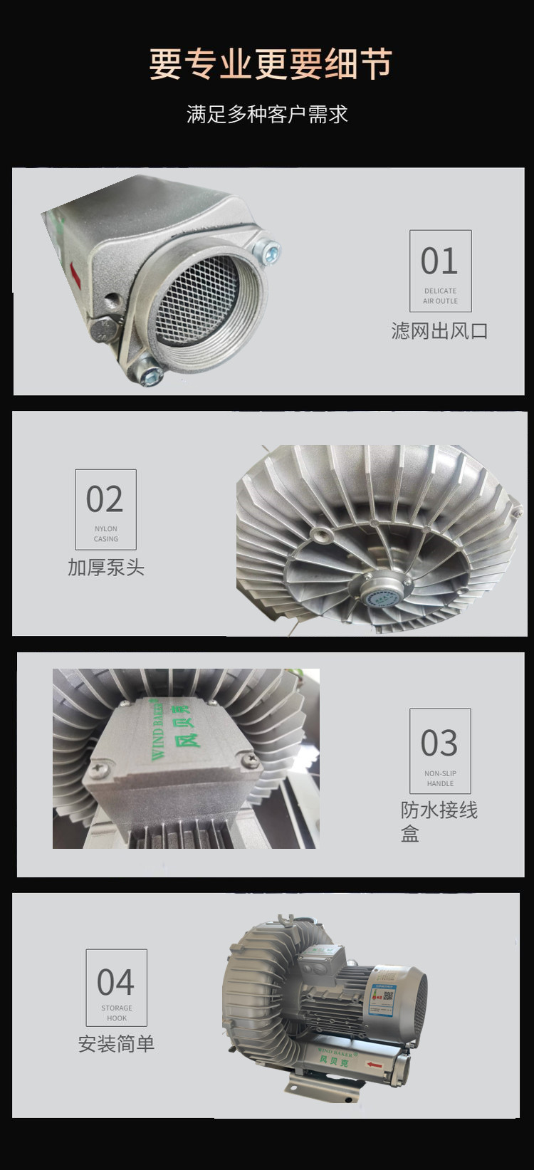 風(fēng)貝克大吸力風(fēng)機 粉塵收集高壓風(fēng)機 吸盤吸紙箱風(fēng)機 吸盤負壓風(fēng)機 粉塵回收風(fēng)機 廢料回收風(fēng)機 粉末回收風(fēng)機 粉末輸送風(fēng)機 高壓鼓風(fēng)機 精工制造 可靠耐用 高壓風(fēng)機風(fēng)壓產(chǎn)生的原理 當(dāng)葉輪轉(zhuǎn)動時,由于離心力的作用,風(fēng)向標(biāo)促使氣體向前向外運動,從而形成一系列螺旋狀的運動。葉輪刀片之間的空氣呈螺旋狀加速旋轉(zhuǎn)并將泵體之外的氣體擠(由吸氣口1吸入)側(cè)槽,當(dāng)它進入側(cè)通道2以后,氣體被壓縮,然后又回復(fù)到葉輪刀片間再次加速旋轉(zhuǎn)。當(dāng)空氣沿著一條螺旋形軌道穿過葉輪和側(cè)槽時,每個葉輪片增加了壓縮和加速的程度,隨著旋轉(zhuǎn)的進行,氣體的動能增加,使得沿側(cè)通道通過的氣體壓力進一步增加。當(dāng)空氣到達側(cè)槽與排放法蘭的連接點(側(cè)通道在出口處變窄),氣體即被擠出葉片并通過出口4排出泵體。使用注意事項:不管是哪個品牌的高壓風(fēng)機,都需要進行兩個方面的保護:一是壓力,二是粉塵1.對于壓力,經(jīng)常使用的是釋壓閥,它是一個卸荷閥,當(dāng)高壓風(fēng)機的使用壓力超過釋壓閥設(shè)定的壓力之后,釋壓閥就會自動打開,把多余的壓力,從而保護高壓風(fēng)機。2.對于粉塵,經(jīng)常使用的是過濾器。它根據(jù)不同的使用現(xiàn)場,往往使用不同的過濾精度的過濾濾芯,不同的濾芯有不同的維護方法和使用壽命,在訂貨時就需要問清楚。在一些特殊的場合,還需要進行特殊的保護:比如說在密封環(huán)境中使用時,要注意通風(fēng)散熱;當(dāng)環(huán)境溫度(進氣溫度比較高時),更要注意通風(fēng)散熱,或者選擇允許進風(fēng)溫度較高的高壓風(fēng)機(比如有一款耐溫高壓風(fēng)機,允許進風(fēng)溫度可達70度)風(fēng)貝克510風(fēng)機配件