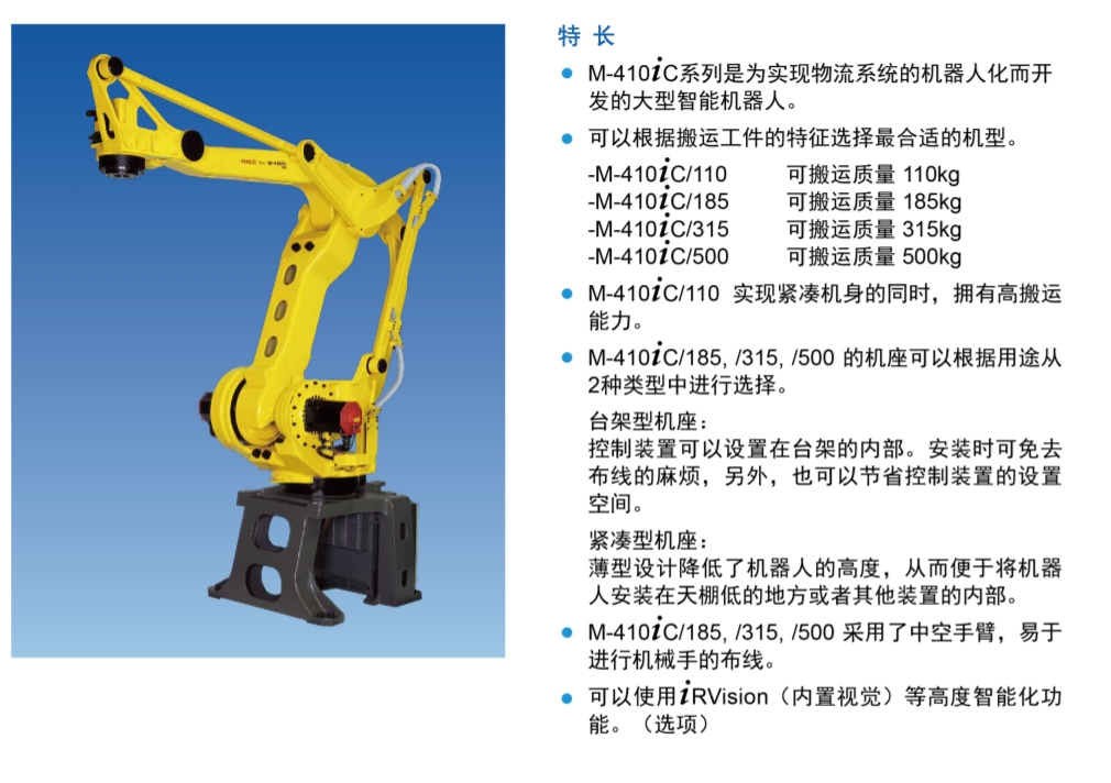 M-410iC/185 是發那科(FANUC)推出的一款大型物流搬運機器人,主要用于**碼垛作業,負載能力為185公斤